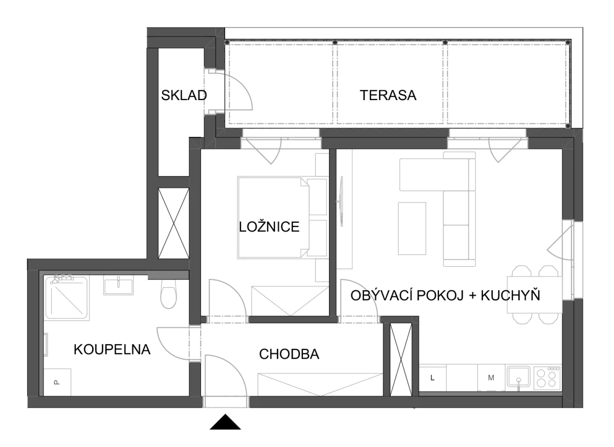 - Obývací pokoj + kuchyň 23.04 m2